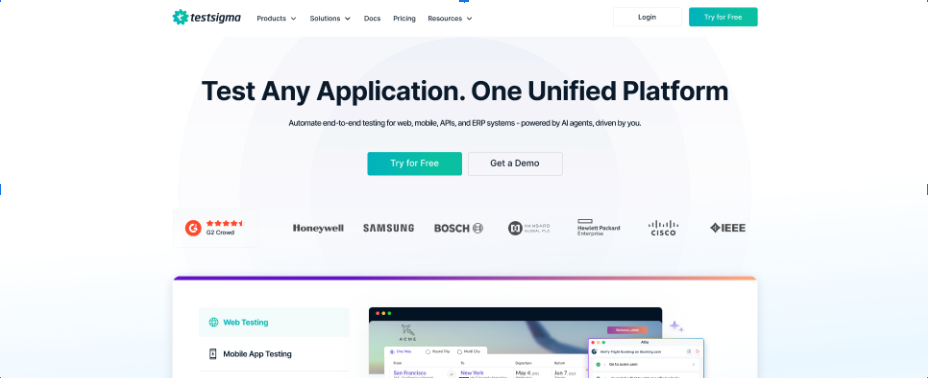Testsigma is a cloud-based, AI-powered test automation platform that provides comprehensive testing capabilities across web, mobile, desktop, API, and Salesforce applications. With its unique no-code approach using plain English, AI-driven auto-healing, and unified platform architecture, it’s our top pick for teams seeking rapid automation adoption with minimal technical barriers.