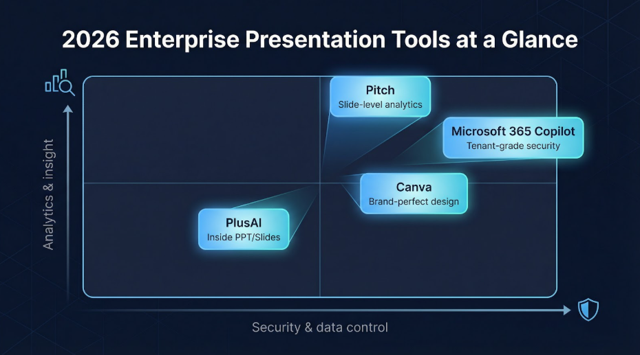 Your presentation teams still spend hours polishing slide decks that end up lost in inboxes. A new wave of AI-powered enterprise tools now drafts slides in seconds, locks in your brand styles, and keeps data safe. Adoption is happening fast: the slide-automation add-in PlusAI reports over one million installs across the PowerPoint and Google Slides marketplaces, a sign that teams embrace AI when it lives inside the editors they already know. Budgets are tight for 2026, and Microsoft 365 Copilot alone costs USD 30 per user each month, so ROI, not templates, is the metric that matters. In this guide, we’ll show you how the four leading platforms stack up and where each one can save you time or money.