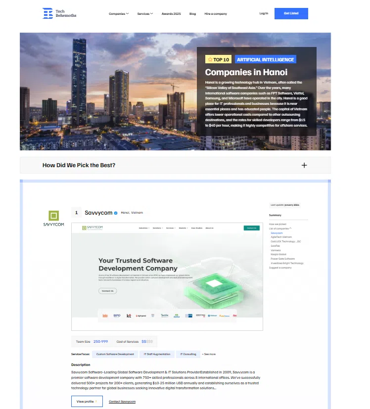 Savvycom has been featured by TechBehemoths among the Top 10 Tech Companies in Hanoi. Particularly in Top 1 of the three categories: